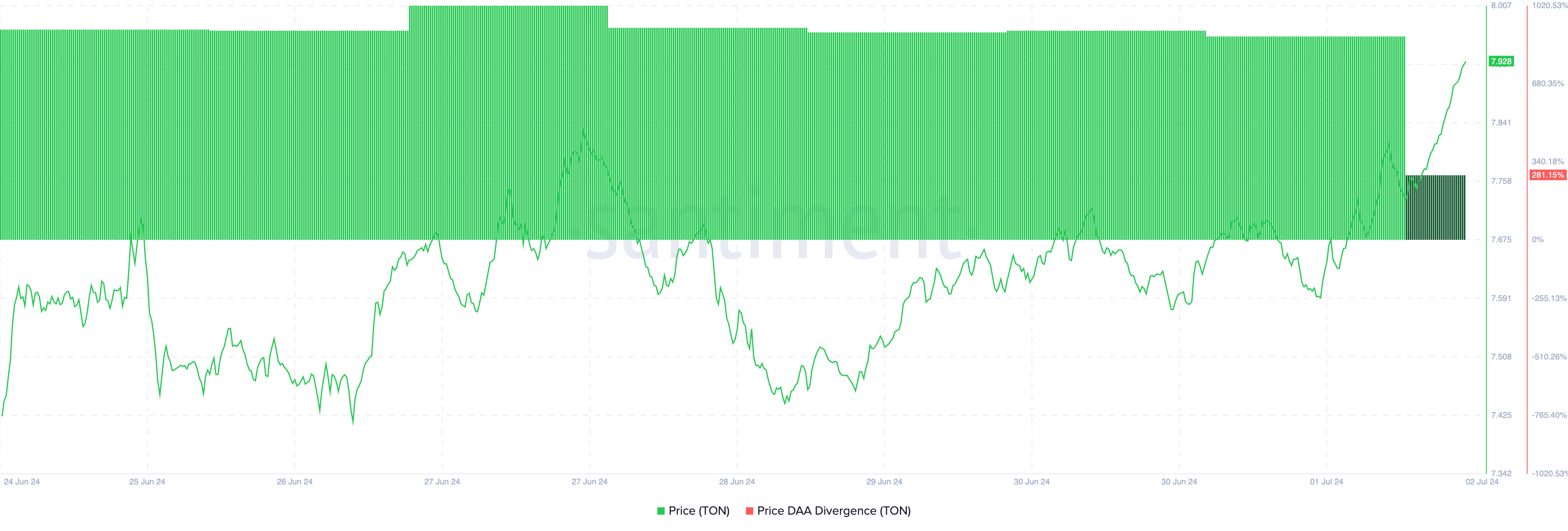 En este momento, la Divergencia de Precio-DAA de TON es del 281.15%. Esto señala que su precio ha aumentado significativamente en comparación con sus direcciones activas diarias. Sugiere una diferencia del 281.15% entre el precio de la altcoin y el cambio en sus direcciones activas diarias.