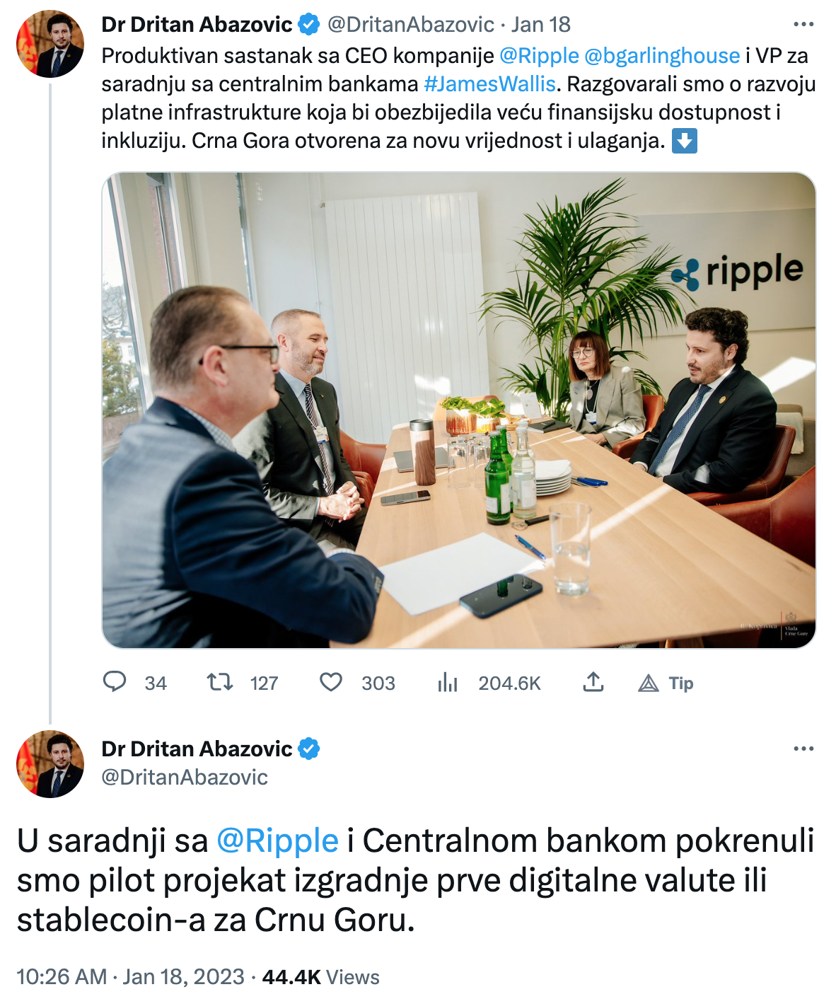 El primero ministro de Montenegro, Dr. Dritan Abazovic, ha confirmado desde su cuenta oficial de Twitter la asociación con Ripple para crear una “divisa digital o una stablecoin” propia del país báltico. En la reunión, se puede ver al CEO de Ripple, Brad Garlinghouse, y a James Wallis, persona de contacto de Ripple dedicado a los bancos centrales y a los CBDC’s, donde concordaron en trabajar juntos en una “prueba piloto para construir la primera moneda digital o moneda estable para Montenegro”, según confirma el el primero ministro de Montenegro.