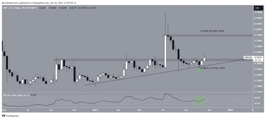 El análisis técnico semanal muestra que XRP ha aumentado junto con una línea de tendencia de soporte ascendente a largo plazo desde principios de año. La línea ha sido validada varias veces, la más reciente en la primera semana de octubre (icono verde).