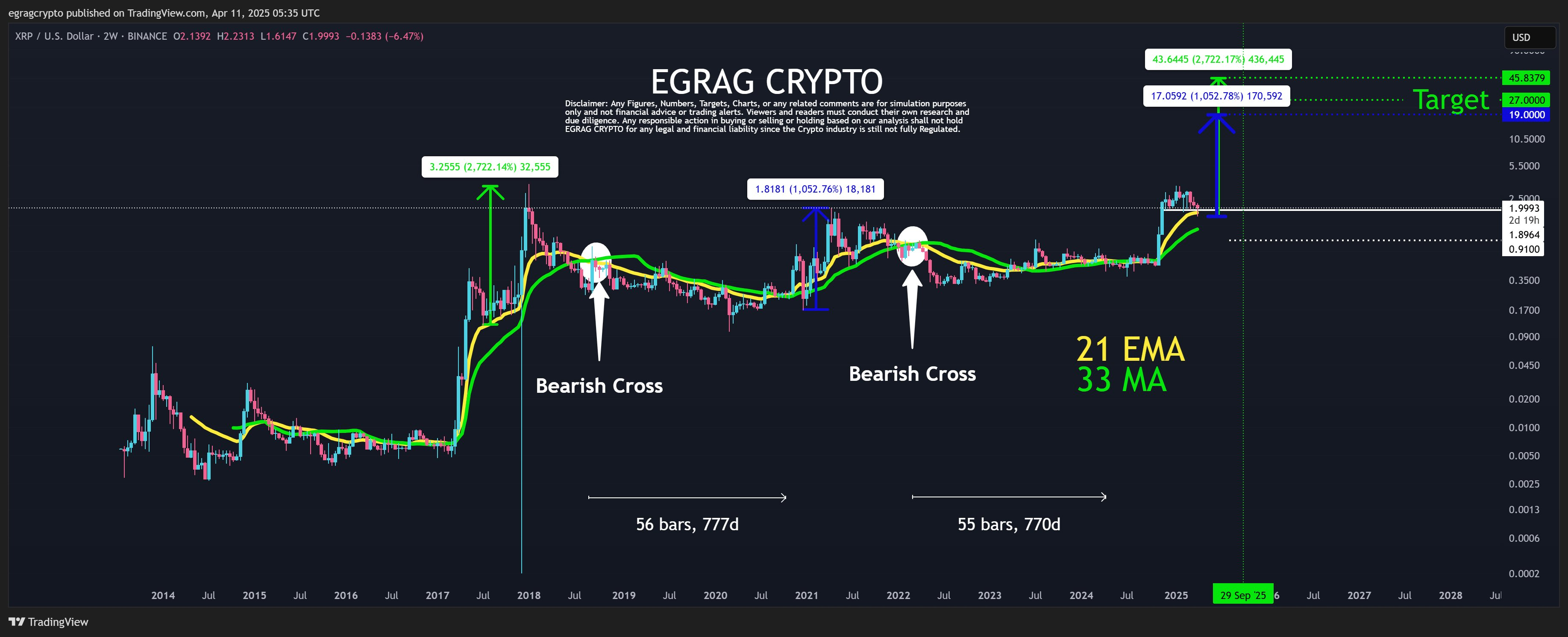 “Los hombres mienten, las mujeres mienten, ¡pero los gráficos no! […] En 2017, el precio encontró un fuerte soporte en la EMA 21 y experimentó el último máximo. […] En 2021, el precio rompió tanto la EMA de 21 como la MA de 33 y luego subió, lo que resultó en un tramo final que marcó el punto máximo del ciclo. […] XRP Imita el movimiento