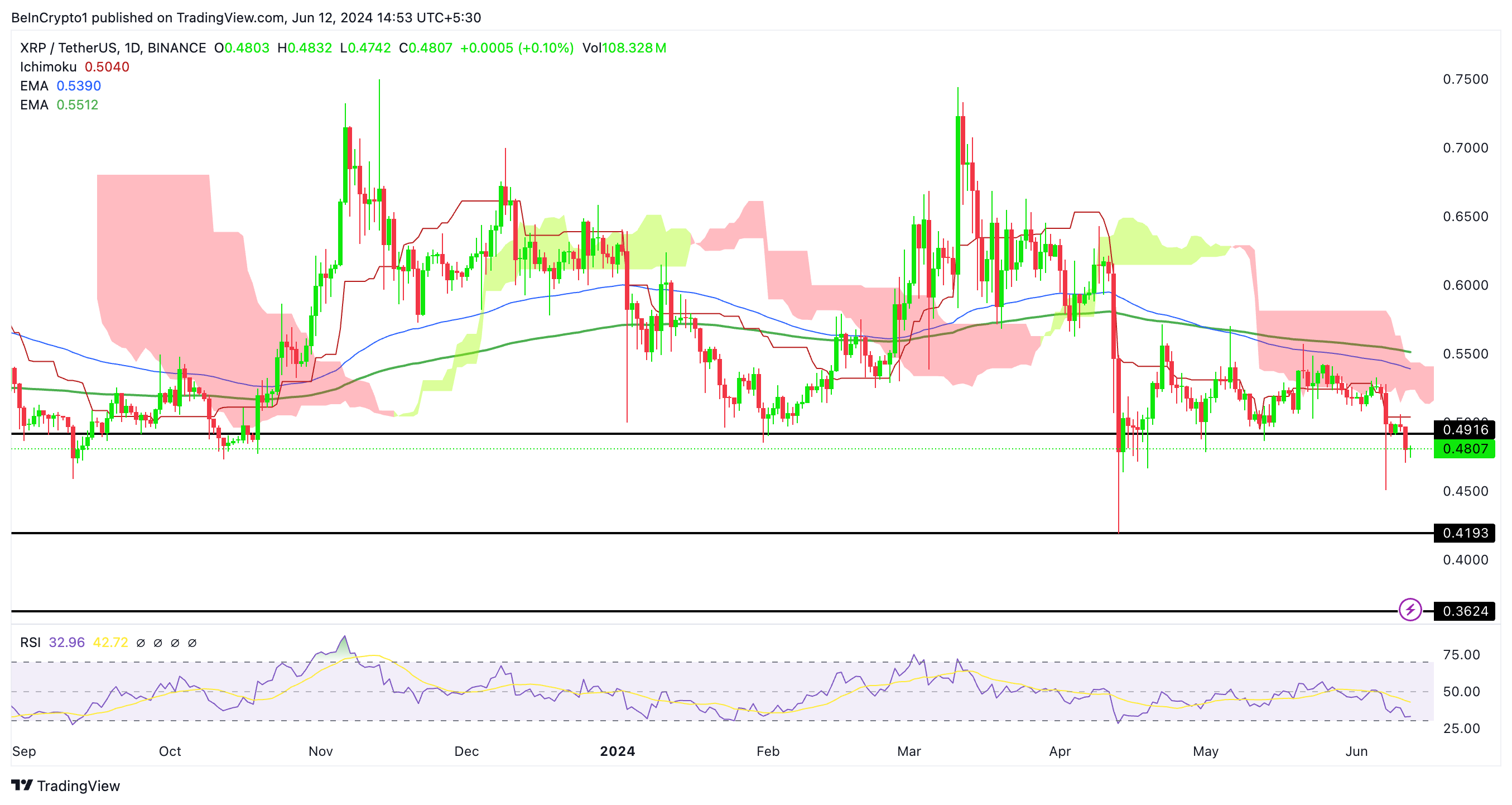 Si XRP supera los 0.49 dólares, las perspectivas cambiarán significativamente. El nivel de soporte clave a vigilar es la línea de base de Ichimoku; una ruptura por encima de este nivel podría señalar un movimiento alcista en el horizonte.