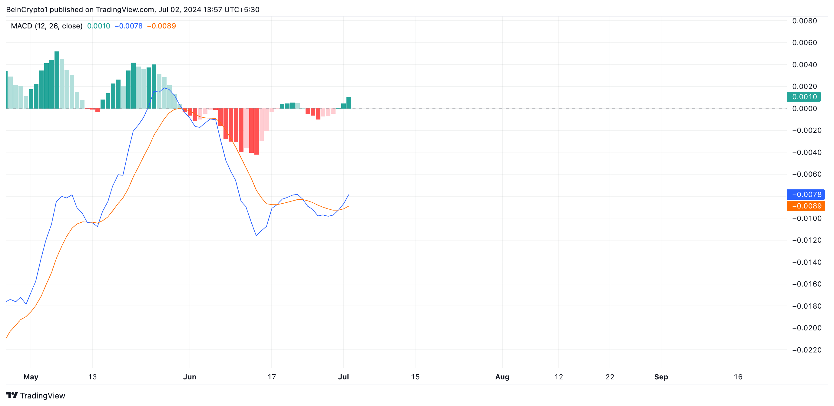A medida que XRP comienza a repuntar, las lecturas de su indicador Convergencia y Divergencia de Medias Móviles (MACD) revelan que ocurrió un cruce alcista de la línea MACD (azul) y la línea de señal (naranja) el 30 de junio.