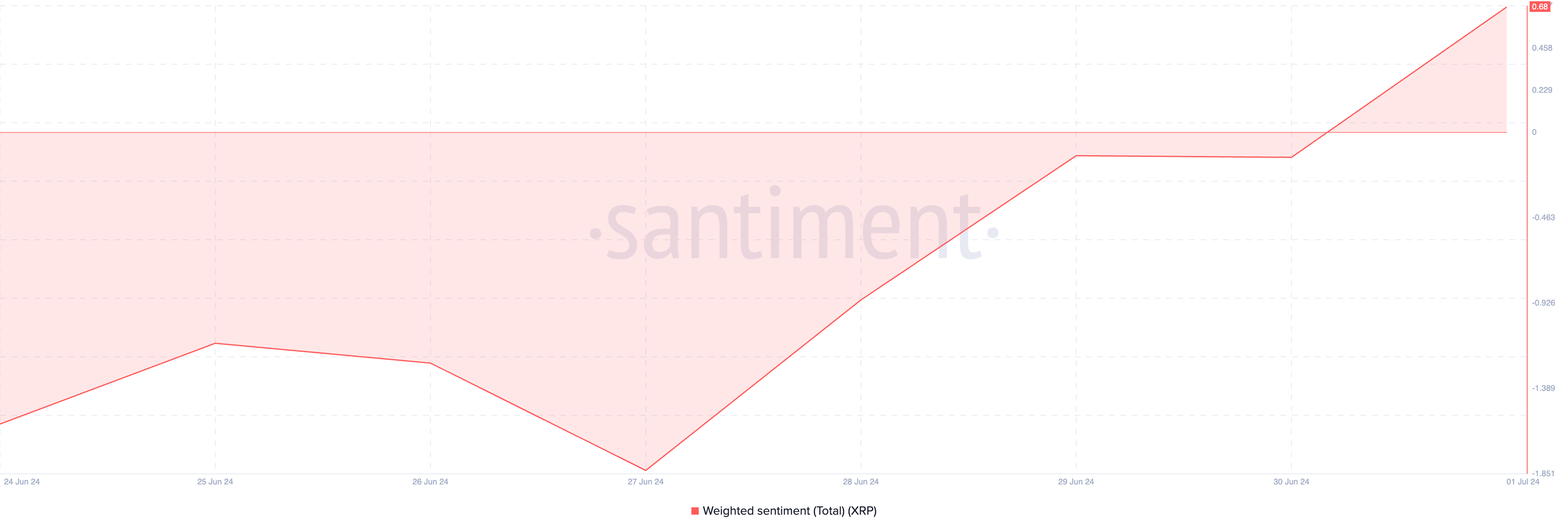 Cuando cambia de negativo a positivo, sugiere un cambio en el sentimiento del mercado de bajista a alcista. Al momento de redactar, el sentimiento ponderado de XRP es 0.68.