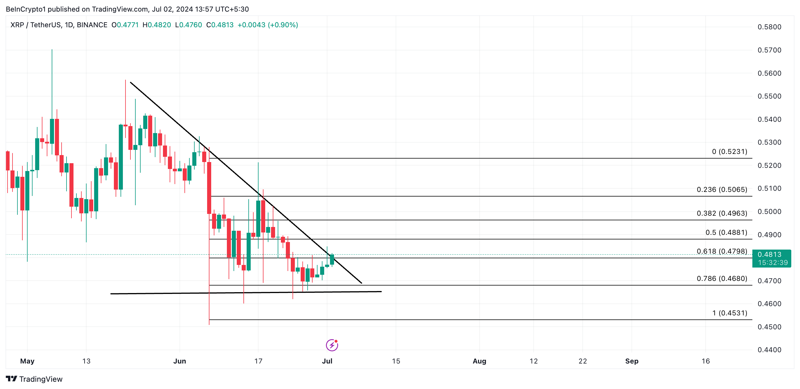 Al momento de redactar, XRP estaba a 0.48 dólares. Se negociaba cerca de la línea superior de su triángulo descendente, que ha formado resistencia desde el 22 de mayo.