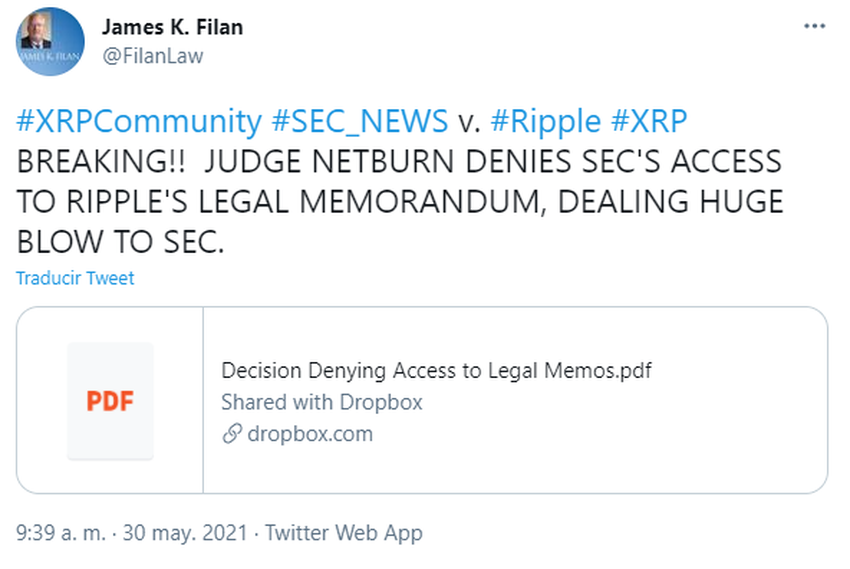 De acuerdo a la decisión publicada el 30 de mayo, la jueza magistrada Sarah Netburn negó la moción de la SEC para obtener acceso a cualquier asesoramiento legal que haya solicitado o recibido Ripple con respecto al estado regulatorio de XRP.