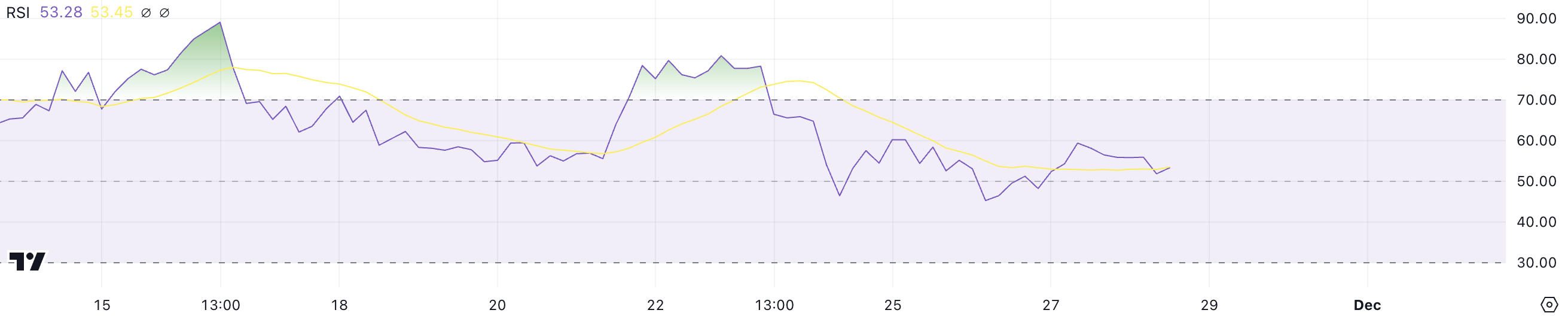 El RSI de XRP actualmente se encuentra en 53.2, reflejando un momentum neutral tras el reciente aumento de precio. El RSI, o Índice de Fuerza Relativa, mide la velocidad y magnitud de los cambios de precio en una escala de 0 a 100.