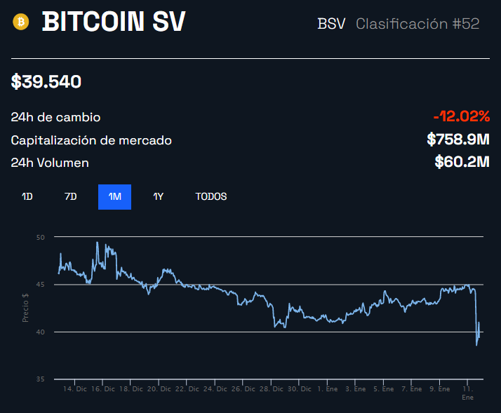 BSV tuvo una caída significativa tras el anuncio de Robinhood. La criptomoneda cayó de poco más de 44 dólares a un mínimo de 37.75 dólares en tres horas. Aunque ha subido un poco desde entonces, BSV sigue cotizando por debajo de los 40 dólares y ha caído un 12% en las últimas 24 horas.