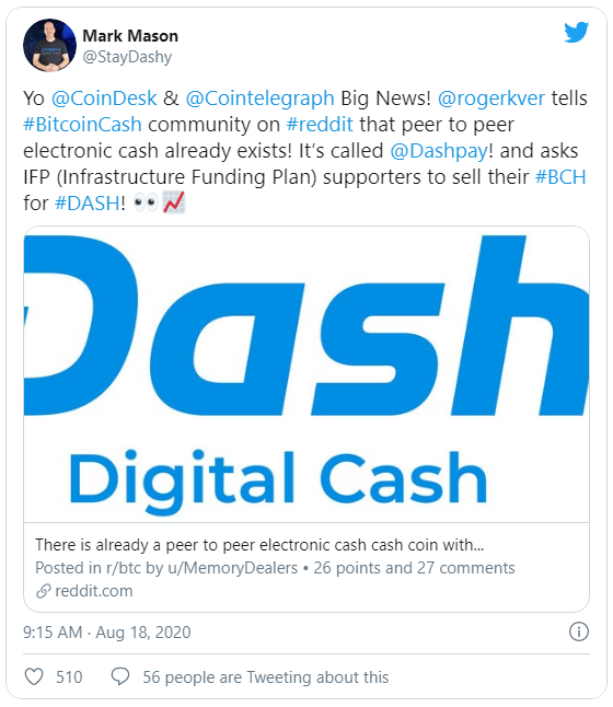La declaración se produjo como resultado de que los usuarios solicitaron un Plan de Financiamiento de Infraestructura (IFP) para BCH. La comunidad de Dash en Twitter se apresuró a señalar la declaración de Ver: