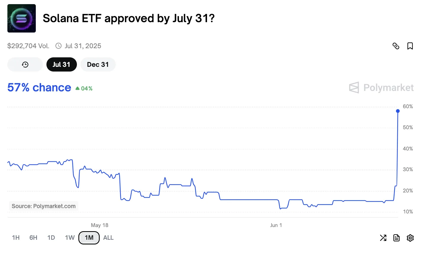 Sin embargo, estas apuestas especifican principalmente diciembre como la fecha de finalización. Hoy, las probabilidades de una aprobación en julio aumentaron un monumental 45%, un gran giro. Aunque esta noticia es muy alcista para Solana, el optimismo no se extendió tanto a otros ETF.