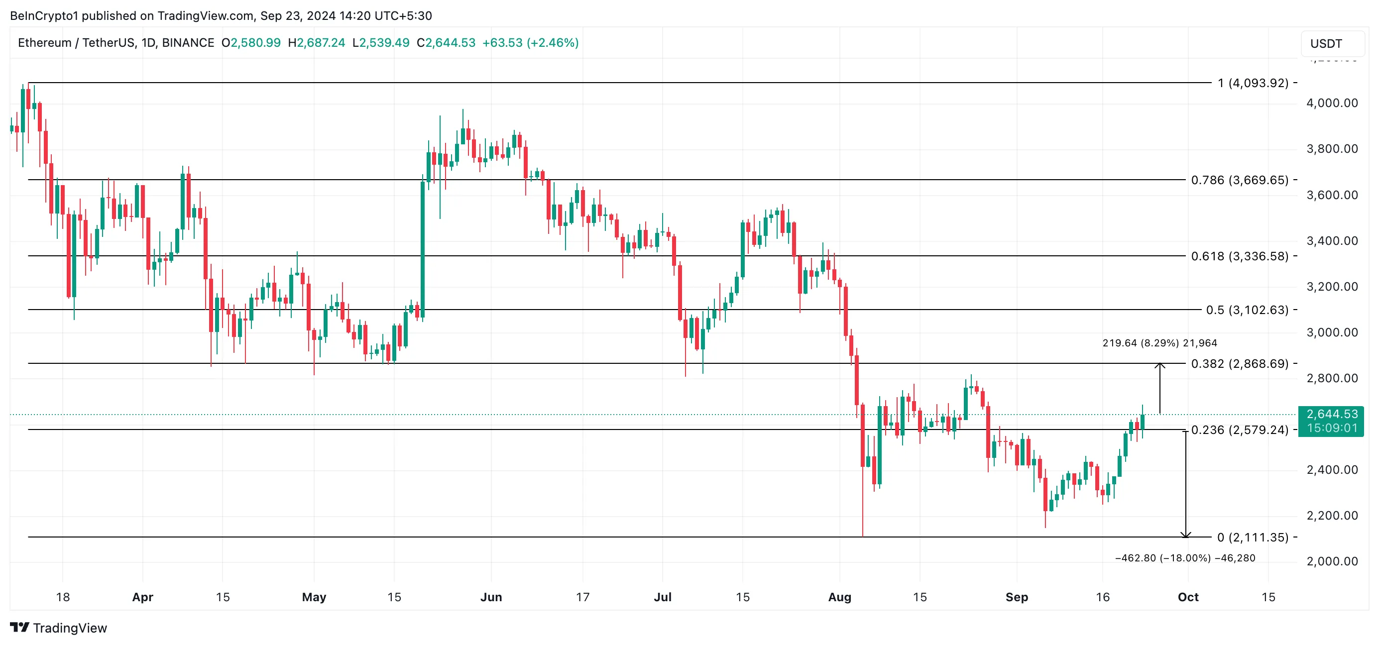 Si este soporte falla, el precio podría caer 18%, alcanzando potencialmente el mínimo del 5 de agosto de 2,111 dólares. Por el contrario, si las ballenas dejan de vender y entra nueva demanda en el mercado, Ethereum podría subir otro 8%, con una fuerte posibilidad de superar la resistencia clave de 2,868 dólares.