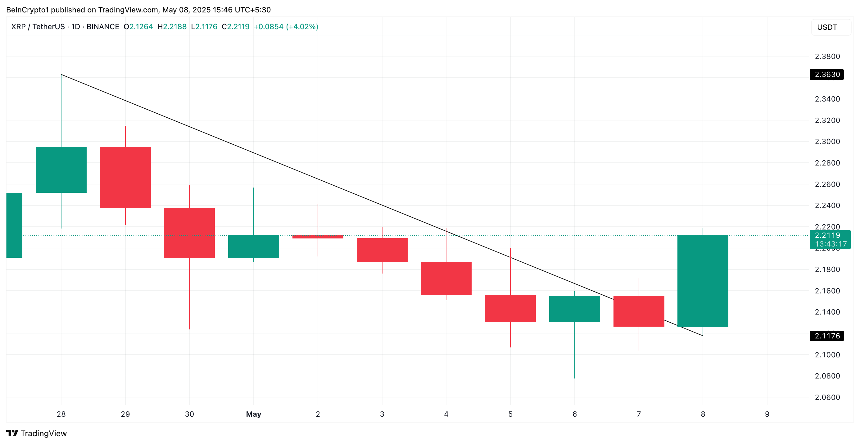 XRP se mantiene sólidamente por encima de la línea de tendencia descendente en 2.21 dólares. Si la demanda se fortalece y la ruptura ve más momentum alcista, podría llevar el precio del token más allá de la resistencia en 2.29 dólares.