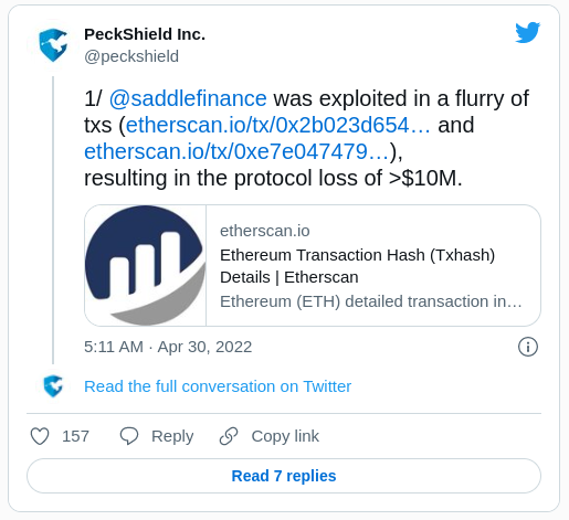 Según la información disponible, Saddle Finance podría haber perdido más si la firma de auditoría de contratos inteligentes y seguridad blockchain, BlockSec, no hubiera notado el exploit.