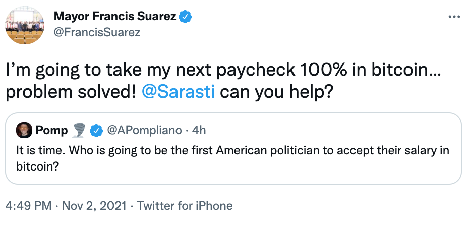 Suarez es bien conocido en la comunidad cripto por su actitud abiertamente pro-bitcoin como en el escenario político de Estados Unidos. Hoy, 2 de noviembre, el alcalde de Miami ha declarado en Twitter, en respuesta a Anthony Pompliano, que se convertirá en el primer político en Estados Unidos en recibir su salario íntegramente en Bitcoin.
