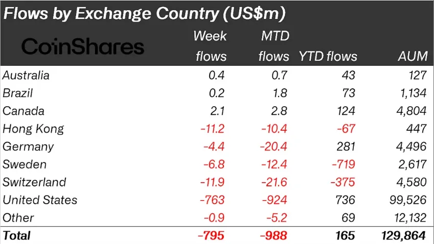 Según la última investigación de CoinShares, las salidas de criptoactivos alcanzaron los 795 millones de dólares la semana pasada. Esto marca la tercera semana consecutiva de flujos negativos, ya que la incertidumbre financiera sigue pesando en el sentimiento de los inversores.
