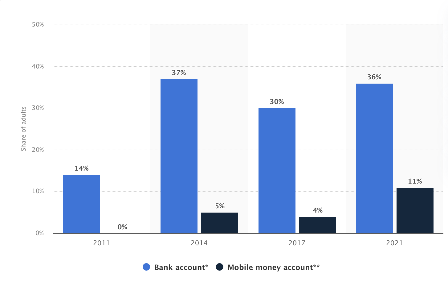 En medio de la participación de los ciudadanos en actividades criminales, El Salvador enfrentó una marcada falta de educación financiera. Según Statista, en 2021, sólo el 36% de la población adulta del país tenía una cuenta bancaria.