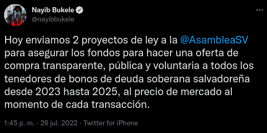 SponsoredBukele afirmó en Twitter que su gobierno ha enviado dos proyectos de ley a la cámara legislativa para aprobar su plan de compra voluntaria de bonos de deuda soberana con vencimiento entre 2023 y 2025.