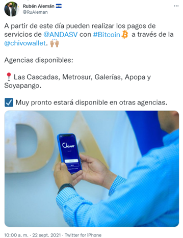 SponsoredEn el tweet se informa que son cinco las oficinas que permitirán pagar este servicio con Bitcoin a través de la Chivo Wallet, a saber: Tachuela redonda Las Cascadas, Metrosur, Galerías, Apopa y Soyapango.