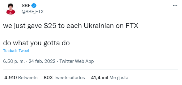 “Acabamos de donar 25 dólares a cada ucraniano en FTX. Haz lo que tengas que hacer”, escribió el hombre más rico de la industria cripto a través de su cuenta en Twitter.