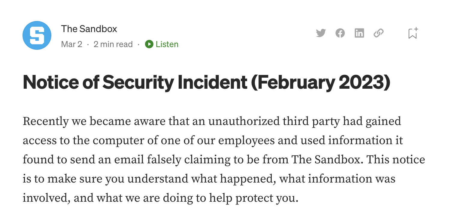 Sandbox escribió a través de un artículo de Medium que los hackers accedieron a uno de los sistemas informáticos de sus empleados a través de una aplicación de malware. Más tarde, los malos actores usaron los datos para enviar correos electrónicos fingiendo ser de The Sandbox y dando acceso al juego Pureland.