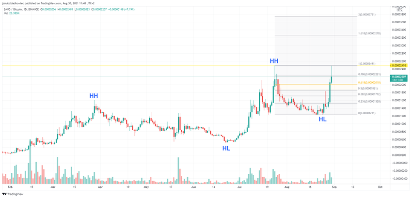 El par SAND/BTC también está proporcionando lecturas alcistas. Actualmente se encuentra en el área del máximo histórico establecido el 24 de julio en 2493 satoshi (línea amarilla). Hoy, el precio validó este nivel como resistencia.