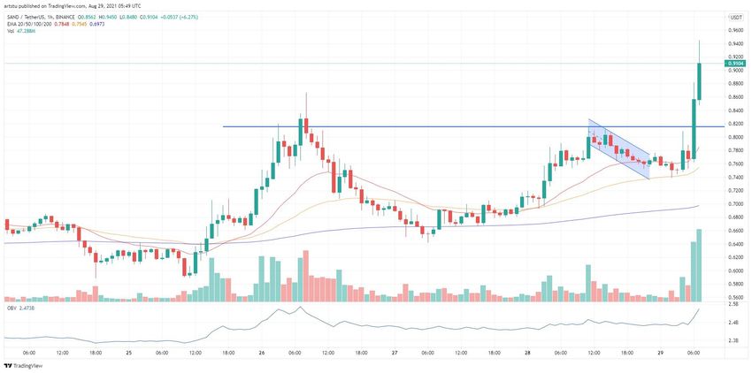 Una fuerte ruptura confirmada por el volumen y los indicadores técnicos hace probable una continuación de los incrementos durante los próximos días. El trader de criptomonedas @hey_shortman tuiteó un gráfico de SAND en el que señala un patrón de taza y asa.