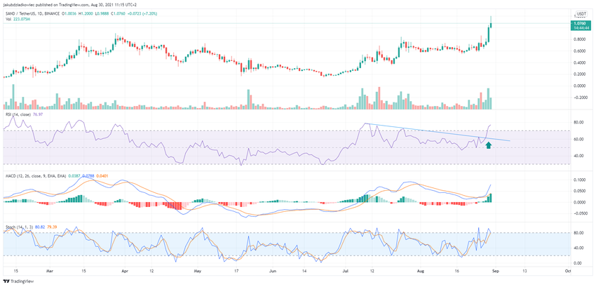Sandbox (SAND) superó ayer la marca de 1 dólar y ha subido desde entonces. El máximo histórico actual (ATH) se registró en 1,20 dólares, pero si el impulso de la ruptura continúa, son posibles objetivos mucho más altos.