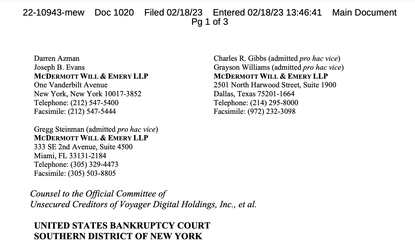 La citación se presentó el 18 de febrero en el Tribunal de Bancarrotas de los Estados Unidos para el Distrito Sur de Nueva York. Pidió específicamente una declaración remota y que proporcionara los documentos y comunicaciones solicitados el 20 de febrero.