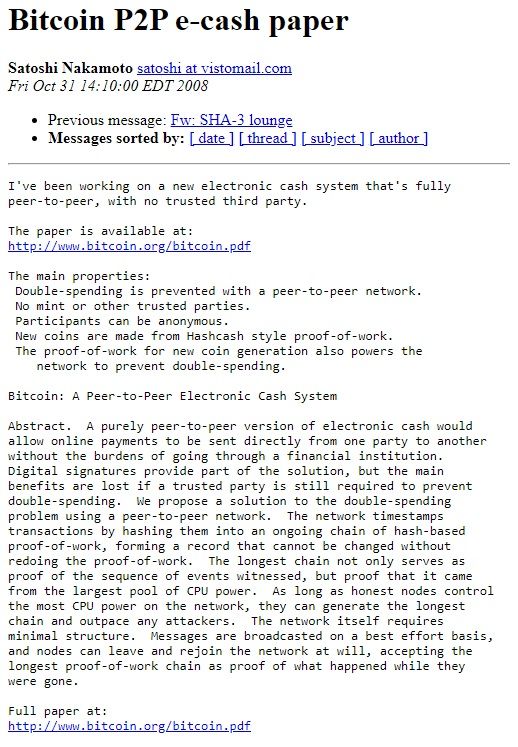 A través del whitepaper, Satoshi Nakamoto explicó los problemas de la centralización de los sistemas de pago electrónicos, proponiendo así un protocolo peer-to-peer descentralizado y a prueba de manipulaciones.
