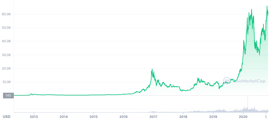 Hace casi una semana Bitcoin registró un nuevo máximo histórico tras superar los 67,000 dólares y actualmente cotiza en 60,300 dólares. Para un novel en el mercado cripto puede parecer una cifra normal pero, hace casi 8 años ¡Bitcoin valía 65 dólares! Desde entonces, Bitcoin se ha disparado más del 91,000% .