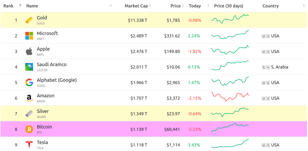 Desde ese momento, Bitcoin ha logrado un crecimiento y reconocimiento importantes. Actualmente, la criptomoneda líder posee 1,139 billones de dólares en capitalización de mercado, ubicándose como el octavo activo más valioso a nivel mundial, por encima de Tesla y por debajo de la plata.