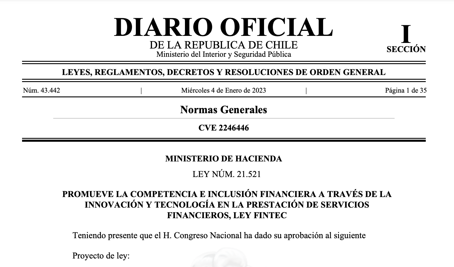 El 04 de enero, el Diario Oficial de la República de Chile oficializó la entrada en vigor de la Ley Fintech, tras años de debates y aprobación reciente por parte del Congreso. La Comisión para el Mercado Financiero (CMF) será el encargado de vigilar el cumplimiento de las disposiciones de la ley.