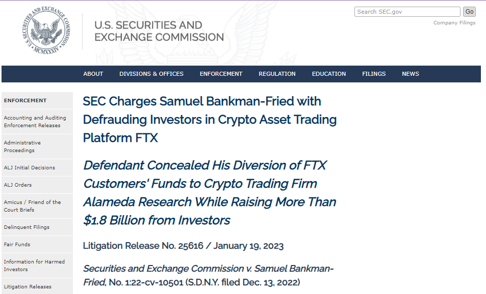 Este 19 de enero la comisión de bolsa y valores de los Estados Unidos, conocida por si siglas en ingles como SEC, ha oficializado los cargos en contra Sam Bankman-Fried (SBF), ex CEO de FTX, por fraude a los clientes de FTX.