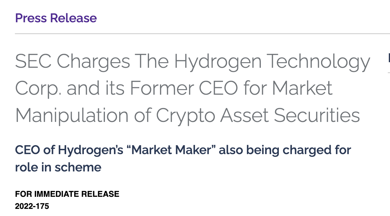 Por lo tanto, en su demanda, la SEC acusa a Hydrogen, Kane y Ostern de violar las disposiciones de registro, antifraude y manipulación del mercado de las leyes de valores. También solicita medidas cautelares permanentes, medidas cautelares basadas en la conducta, restitución con intereses previos al juicio, sanciones civiles y otros remedios.