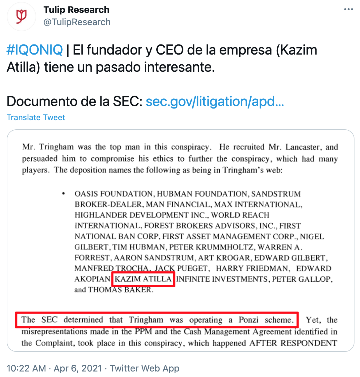 Hoy, 6 de abril, ha resurgido de las cenizas una información algo sensible para Kazim Atilla, fundador y CEO de la nueva plataforma de fans del deporte IQONIQ , aplicación aún se encuentra en fase de lanzamiento. Atilla fue nombrado y relacionado con un esquema ponzi declarado por el U.S. Securities and Exchange Commission (SEC), organismo regulador del mercado estadounidense para proteger a los usuarios de fraudes.