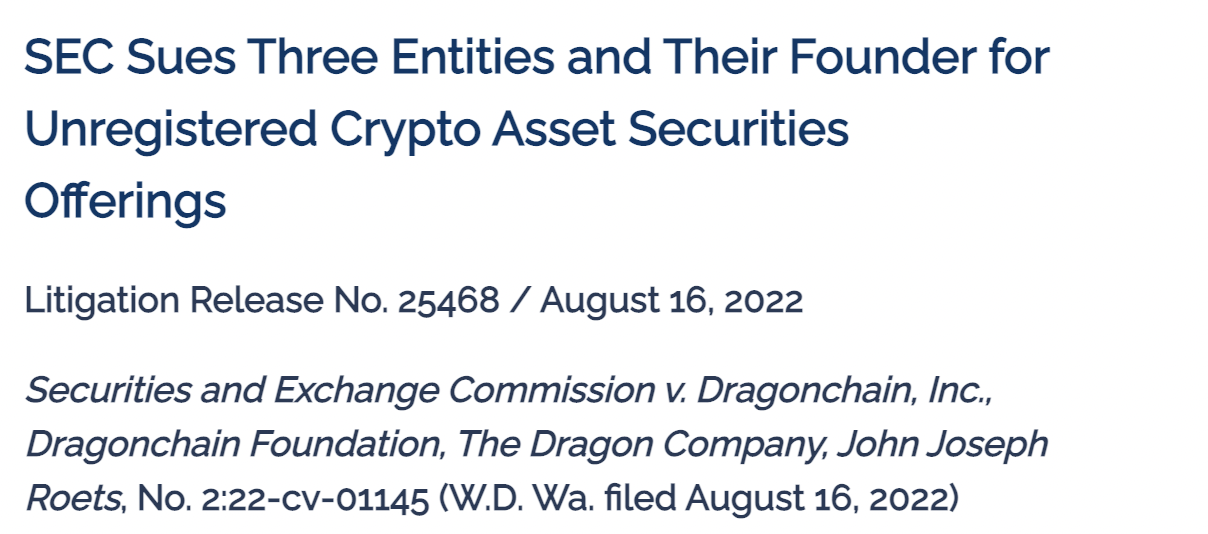 La SEC afirma que Dragonchain y su fundador, John Joseph Roets, recaudaron ilegalmente más de 16 millones de dólares en ‘ganancias a través de ofertas no registradas y ventas de valores a aproximadamente 5,000 inversionistas en los Estados Unidos y en el extranjero’, y son responsables de diversos aspectos del presunto esquema, que ocurrió en 2017.