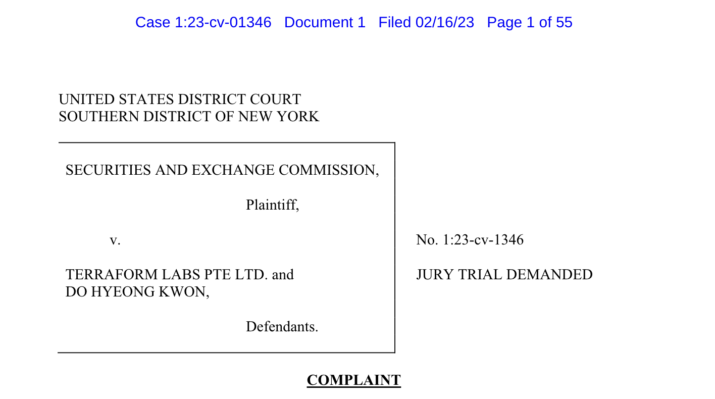 El 16 de febrero, la SEC presentó una demanda en un tribunal federal de Estados Unidos, alegando que TFL y Do Kwon ofrecieron y vendieron valores no registrados, incluidas stablecoins, además de llevar a cabo un plan que eliminó al menos 40,000 millones de dólares en valor de mercado para la criptomoneda.