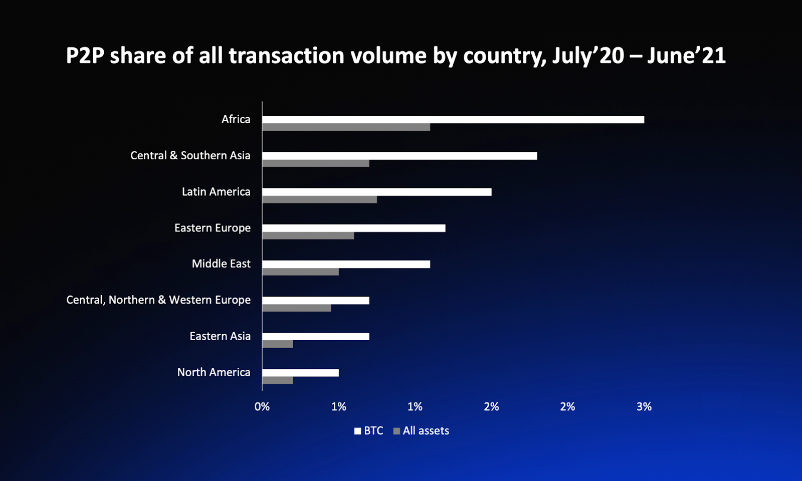 Un total de 105,6 mil millones de dólaresen activos de criptomonedas se negociaron en África entre julio de 2020 y junio de 2021, una tasa de crecimiento de 1,200% interanual. El trading P2P domina los volúmenes de transacciones.