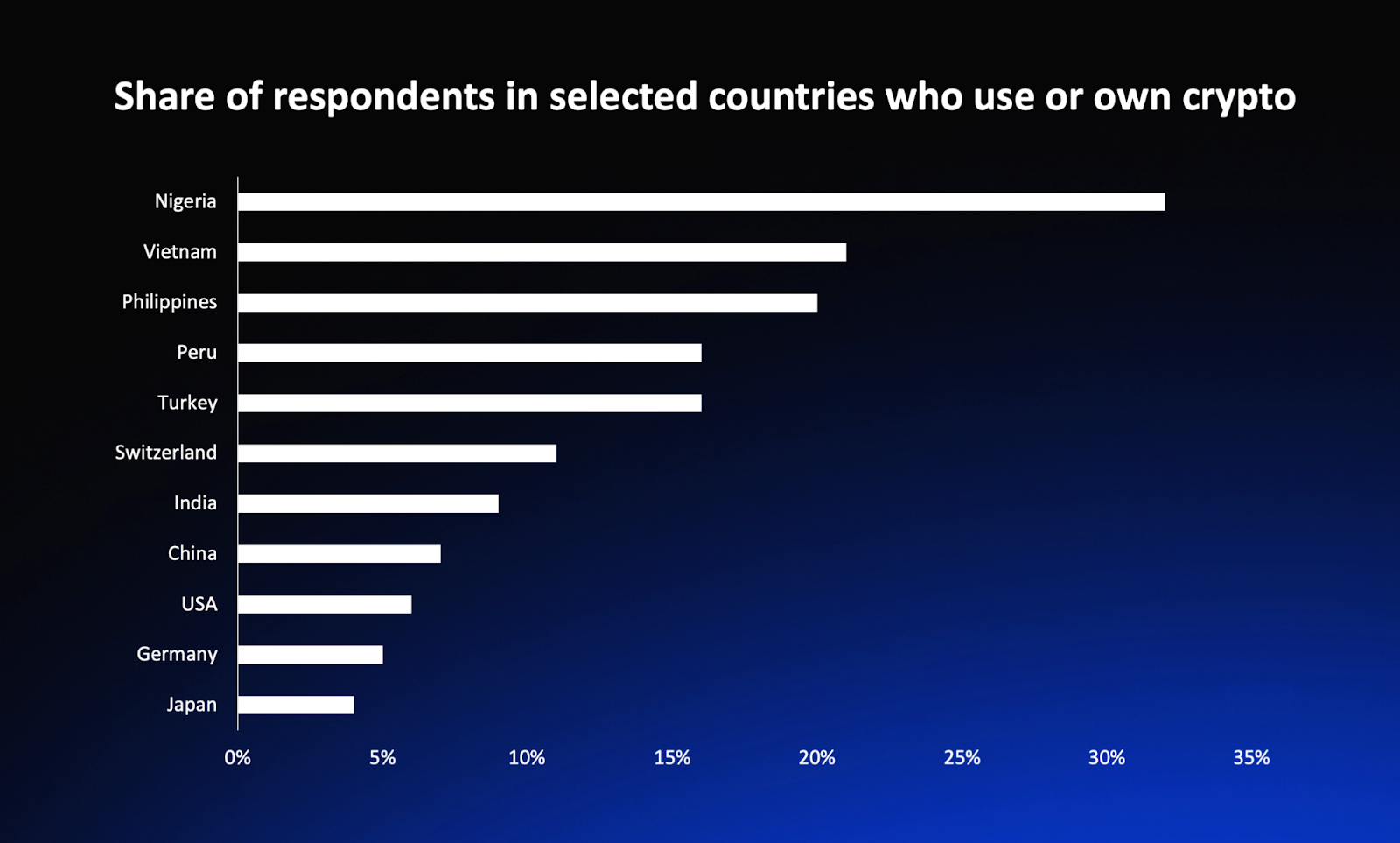 - Un asombroso 32% de los nigerianos y 21% de los vietnamitas poseían criptomonedas en 2020, la primera y la segunda tasa más alta del mundo, y significativamente más alta que el 6% de Estados Unidos.