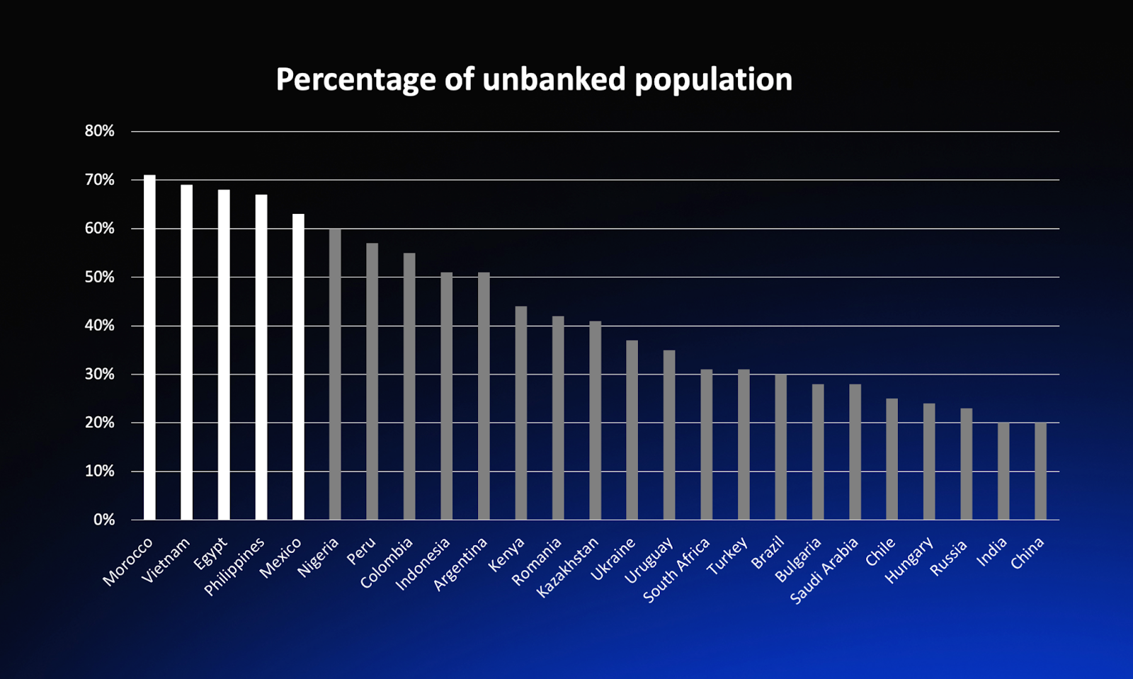 Falta de infraestructura financiera – África y Asia son los continentes menos bancarizados. Casi el 70% de los adultos en países como Vietnam y Marruecos no tienen una cuenta bancaria: