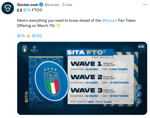 La Selección de fútbol de Italia, tetracampeona del mundo, y actual campeona de Europa, ha anunciado el lanzamiento del fan token $ITA en alianza con Socios.com, el cual saldrá a la venta el próximo lunes 7 de marzo.