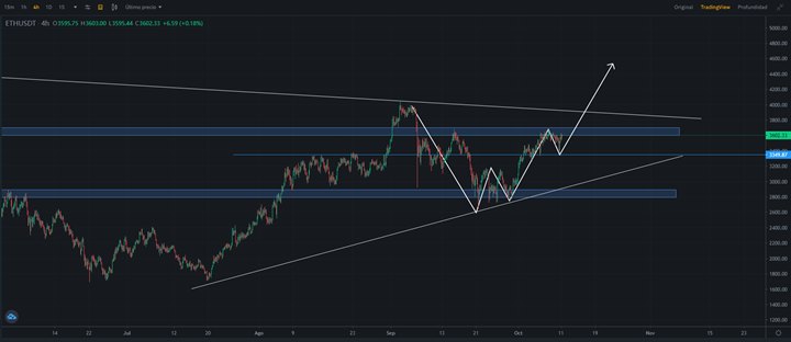 Para el caso de Ethereum repite el mismo patrón que Bitcoin, viene de romper la cuña bajista que llevaba varias semanas atrás, y presenta una formación chartista (W), la cual es bastante alcista.