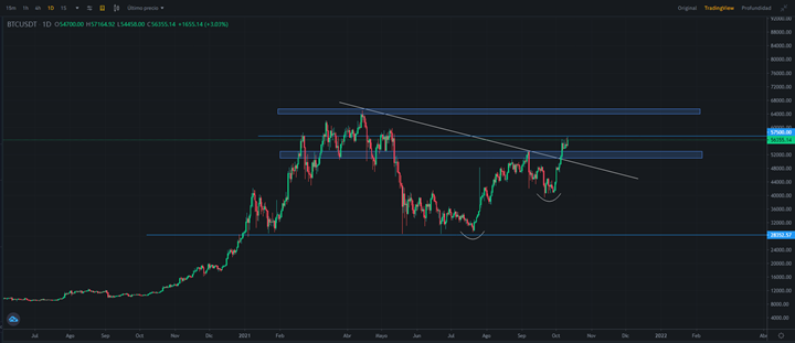 Un precioso giro de tendencia logró superar dicha cuña rompiendo la resistencia de los 45,000 dólares. Desde entonces no ha parado de subir, hasta llegar a unos increíbles 57,000 dólares. Actualmente se encuentra formando un patrón equilibrado y de aceptación por parte de los inversores minoristas.