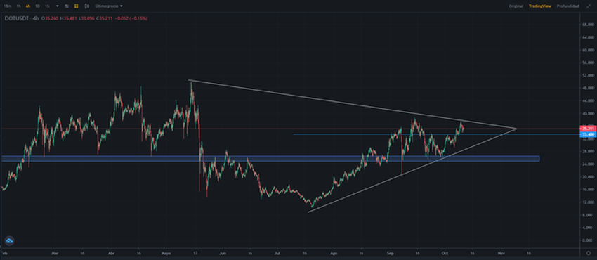 En temporalidad de 4 horas, Polkadot se ve de momento dentro de una triangulación, el rechazo que presenta sobre los 37 dólares lo podría llevar al soporte de los 33.4 dólares para intentar hacer un intento más por superar esa resistencia.