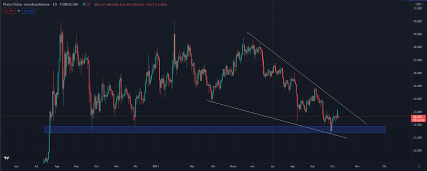 Este metal se encuentra en una zona clave y presenta una cuña bajista. La fuerza vendedora lo hizo nuevamente llegar a los mínimos de este año 2021, alrededor de los 21.40 dólares. También se ve claramente como esta caja de resistencias es un precio clave y de gran interés para los inversores, logrando hacer un fuerte rechazo y nuevamente ubicarlo sobre los 22 dólares.