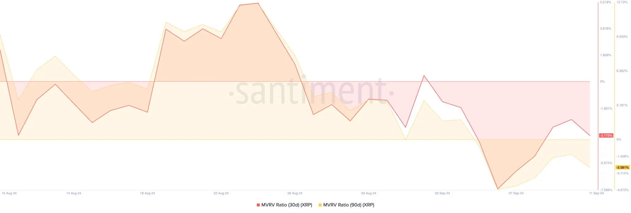 XRP ha perdido casi el 10% de su valor en el último mes. Esta caída de precio ha llevado a una relación negativa entre el valor de mercado y el valor realizado (MVRV), lo que sugiere que el séptimo criptoactivo por capitalización de mercado podría estar infravalorado. Hasta ahora, las relaciones MVRV de 30 y 90 días de XRP son -3,85 y -2,66, respectivamente.