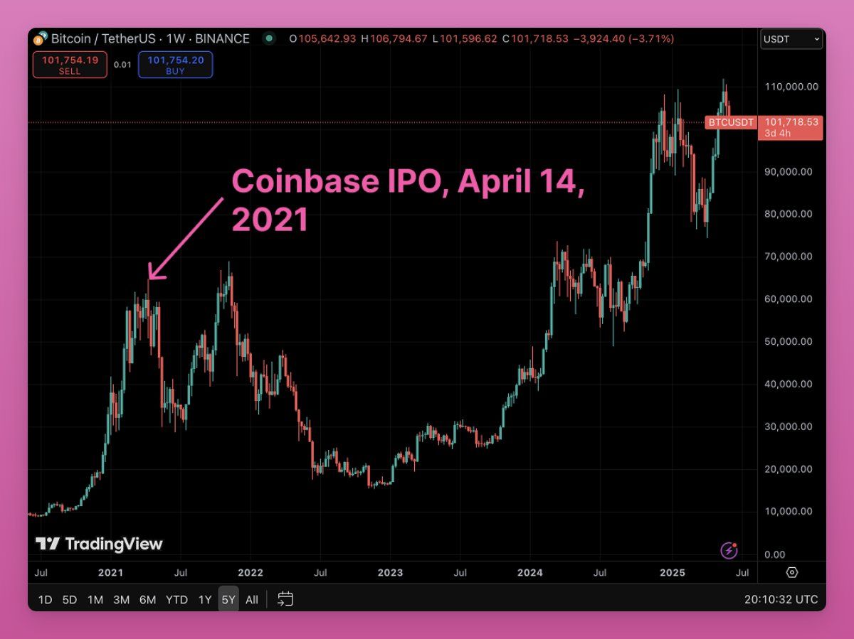 Según Ignas, un analista conocido en X y cofundador de Pink Brains, la IPO de Coinbase el 14 de abril de 2021 marcó un pico local para Bitcoin.
