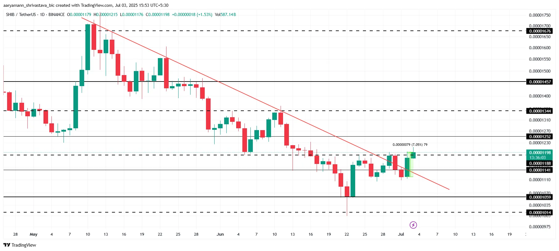 El precio de Shiba Inu ha subido 7%, alcanzando 0,00001198 dólares en el momento de escribir. Este movimiento ascendente ha permitido a SHIB escapar de una tendencia bajista de dos meses, señalando un posible cambio en el sentimiento del mercado.