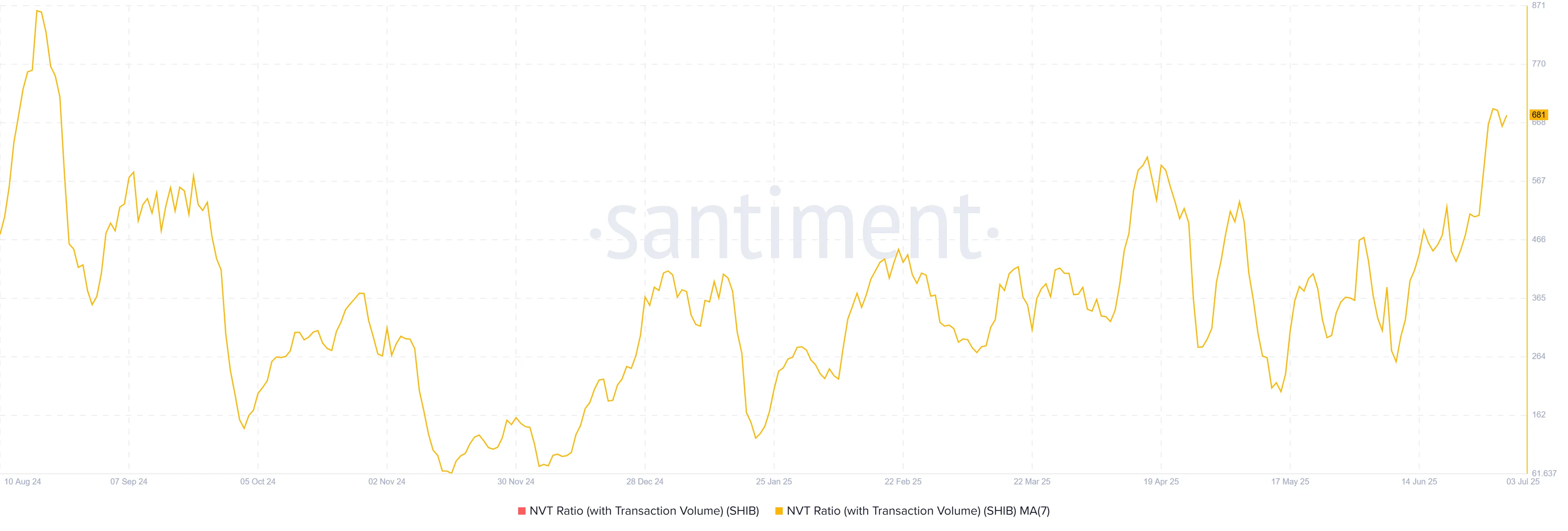 El ratio de Network Value to Transaction (NVT) para Shiba Inu ha alcanzado recientemente un máximo de 11 meses. Este aumento sugiere que la valoración de la red está superando su actividad de transacciones, una señal de que el activo se está sobrevalorando.
