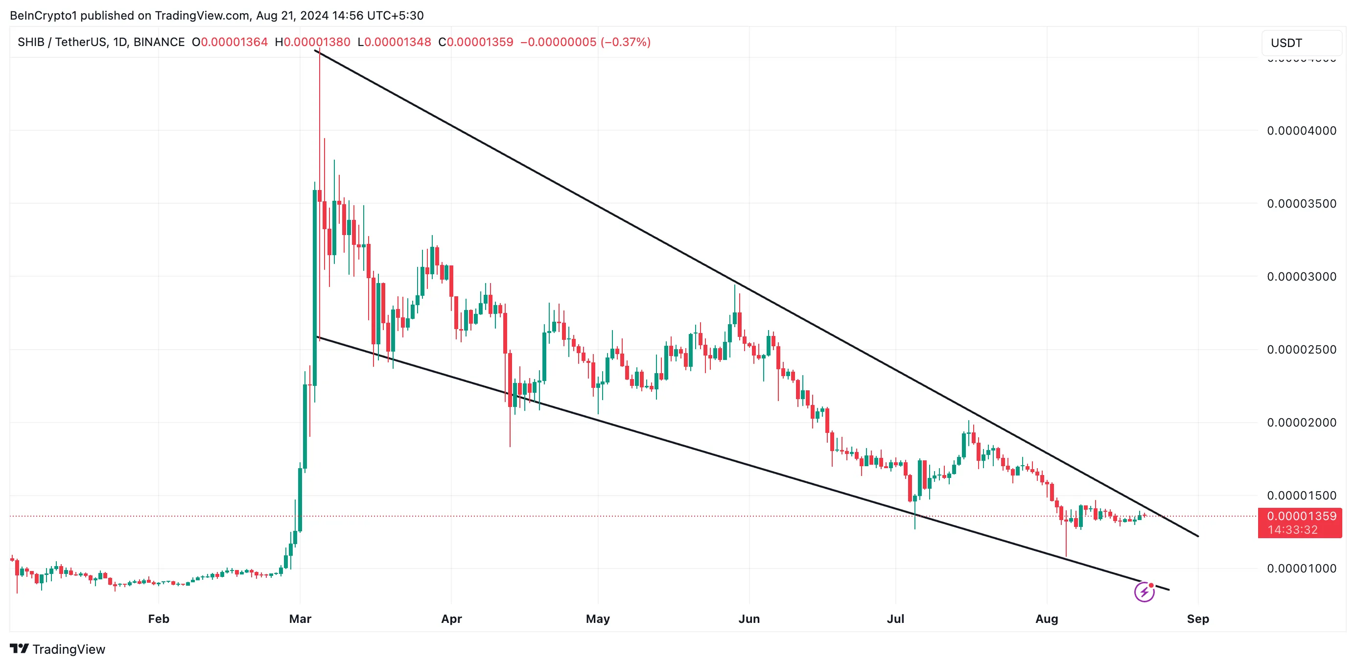 Desde alcanzar un máximo anual de 0,000035 dólares el 5 de marzo, el precio de SHIB ha disminuido constantemente, formando una cuña descendente. Este patrón se desarrolla cuando el precio de un activo crea una serie de máximos y mínimos más bajos que convergen, creando una forma de cuña.