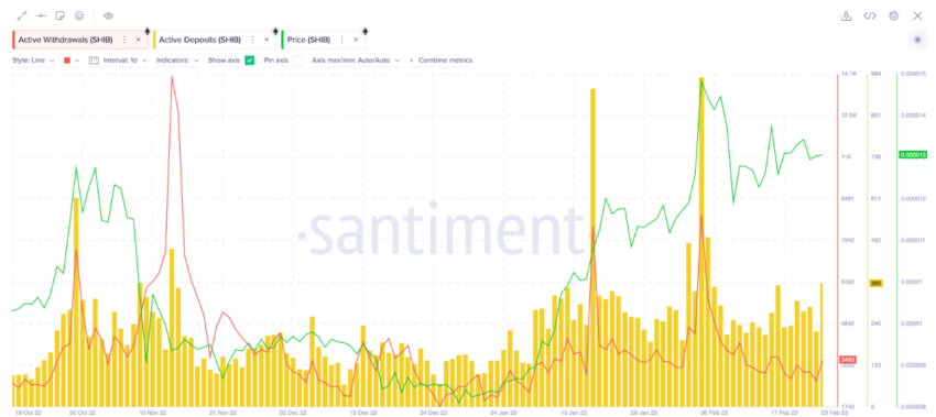 Según Santiment, una comparación pictórica de depósitos activos con datos de retiros activos muestra que más holders transfieren su SHIB a los exchanges en comparación a quienes lo retiran. Históricamente, el precio de Shiba Inu tiende a caer cuando los depósitos superan persistentemente los retiros.